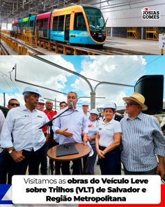 Participei da agenda com o ministro da Casa Civil, Rui Costa, e o governador Jerônimo, das obras do Veículo Leve sobre Trilhos (VLT) de Salvador e Região Metropolitana. A visita da nossa equipe de trabalho incluiu inspeções nos trechos dos Lotes 1 e 2 do projeto, passando por áreas como a Suburbana, Periperi, BR-324 e Águas Claras.